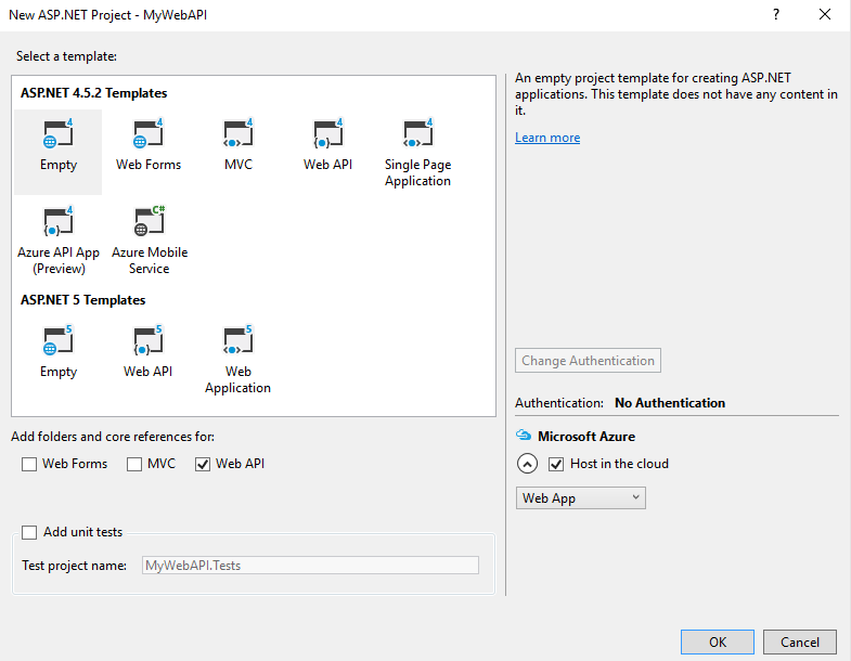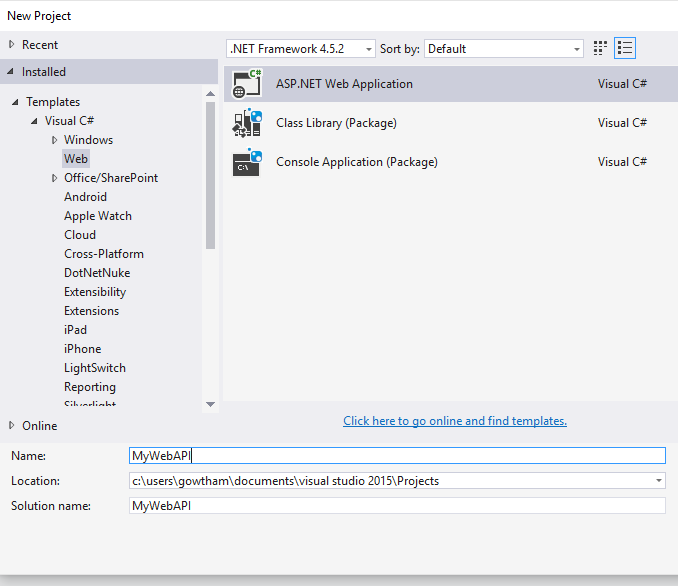 Create an empty WEB API application using an installed web template in visual studio as in the following figures: