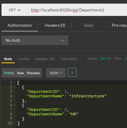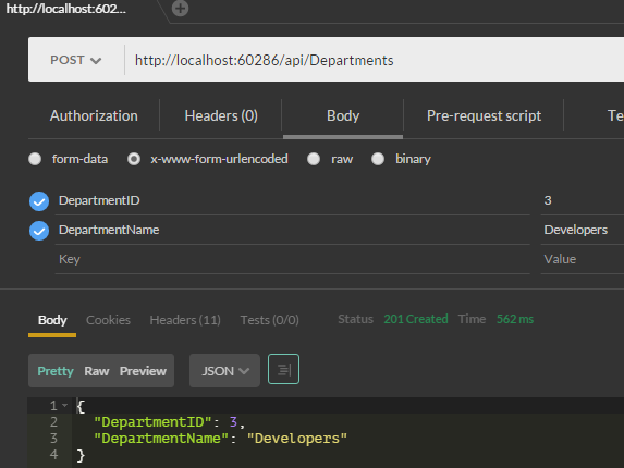 Figure 15 POST: api/Departments – add the new record in department using this API,