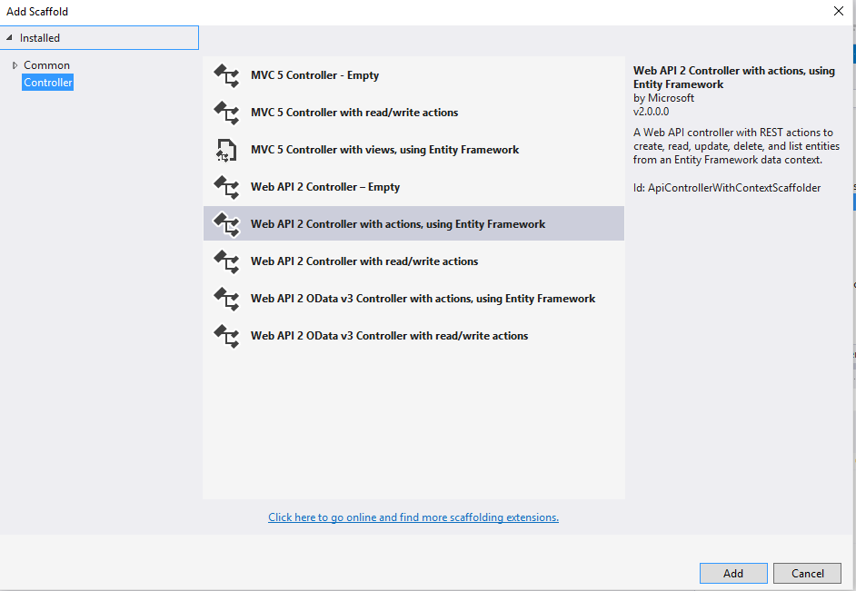 In Solution Explorer, right-click the Controllers folder. Select Add, then Controller.