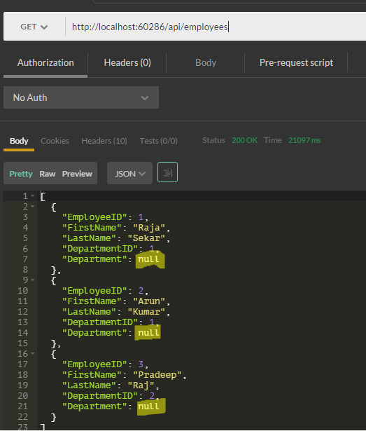 From the above image we can notice that we are getting null value for department. This is because Entity Framework is not loading the related department entities.