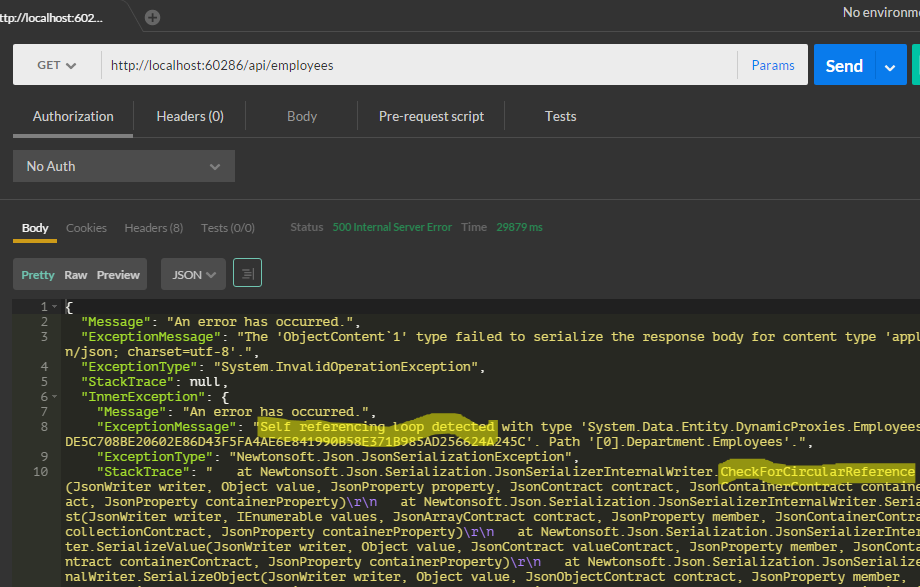 We have defined a navigation property on the Employee class for the Employee-department relationship, suppose if we add the navigation property to the department class it will create an issue when we serialize the models. If we load the related data, it creates a circular object graph.