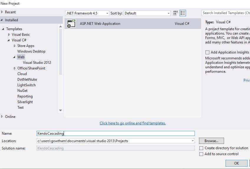 - Select Web in the installed template and select ASP.NET Web Application.