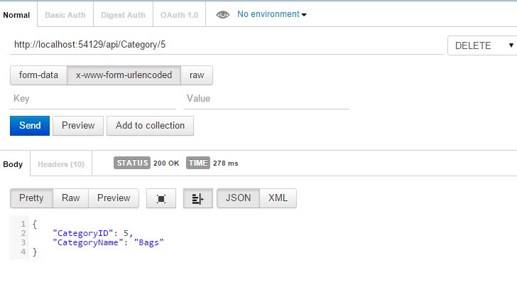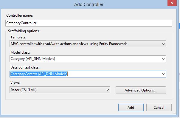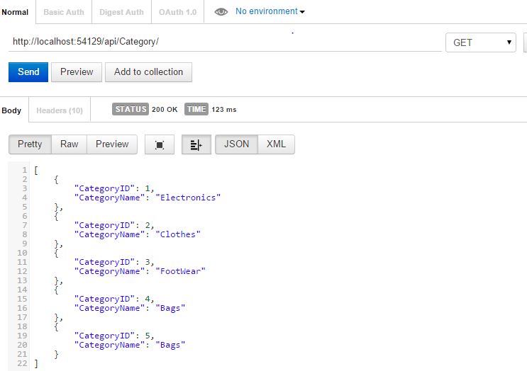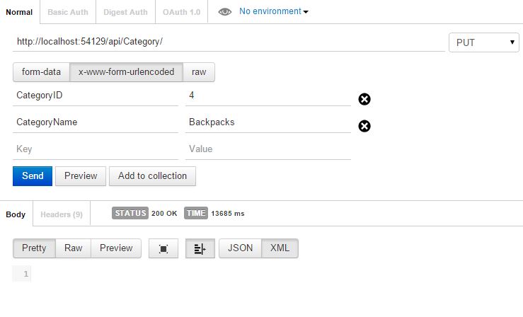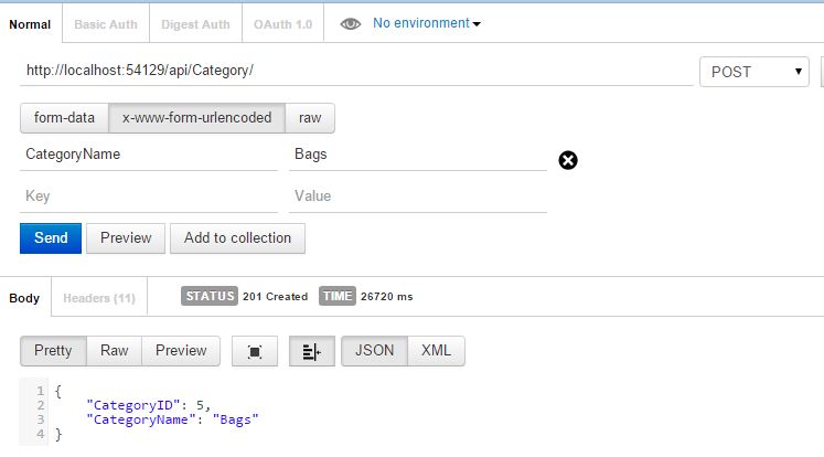 Open the Category controller class. You will see some predefined code with GET, PUT, POST and DELETE HttpResponses.