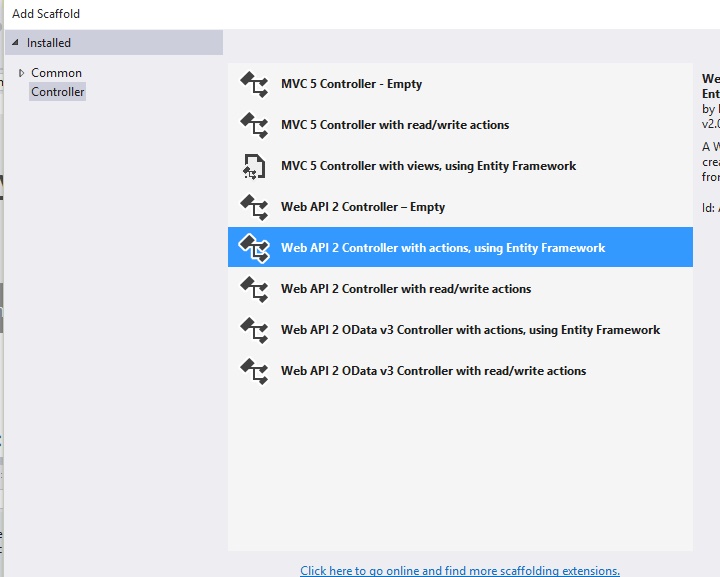 Right-click on the Controller folder then select Add, click Controller and create a Web API 2 controller class as in Figures 5 and 6.