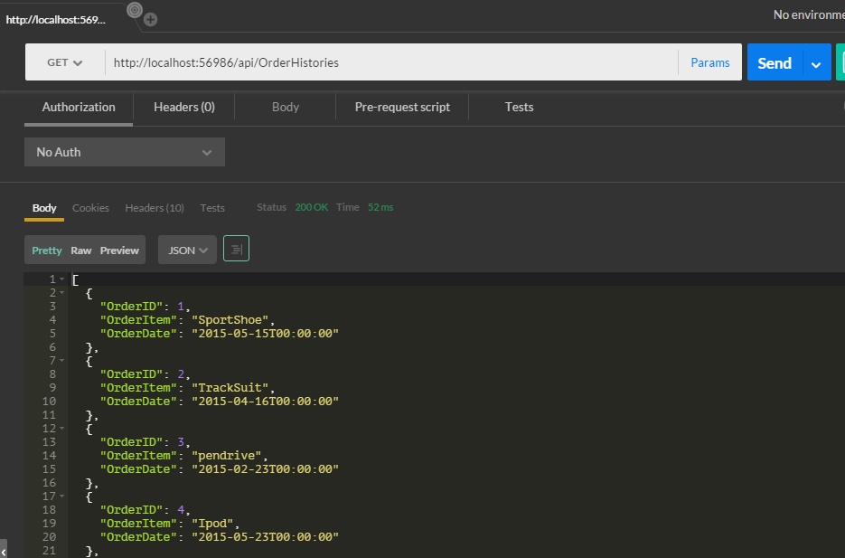 You will get some pre-defined HTTP GET, POST, PUT and DELETE requests/responses in the Order Histories Controller. Modify the code based on your application requirements. For this example I didn't modify the code.