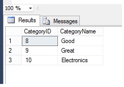 I have created a simple table with two columns, CategoryID and CategoryName.