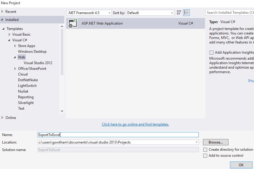 - Select Web in the installed template, then select ASP.NET Web Application.