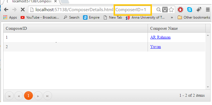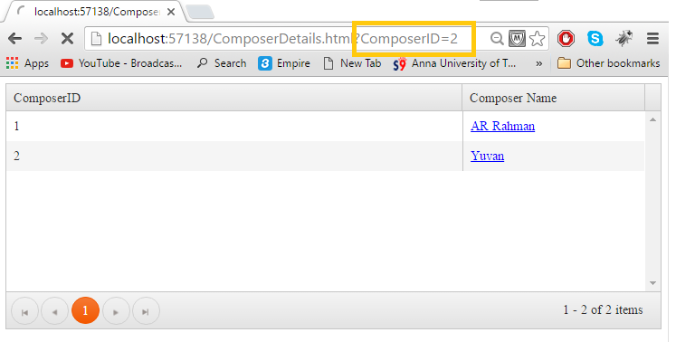 3. In the click event function we are fetching ComposerID value from grid and passing it as query string.