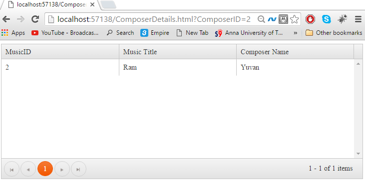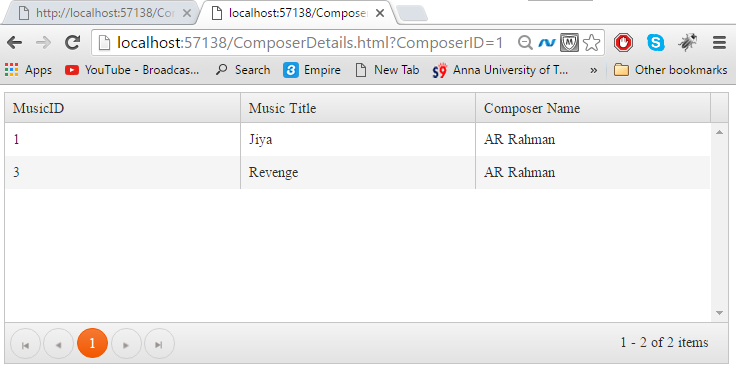 2. Reading the Url -"/api/Musics/"+ urlParams["ComposerID"]+ "/details" to bound the Kendo grid with Composer details based on ComposerID