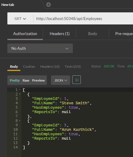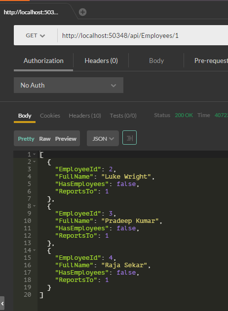 From the above image it is clear that the api/employees/{EmployeeId} API gives you the details of employee who have the report to value by filtering it with EmployeeID which is send through the request