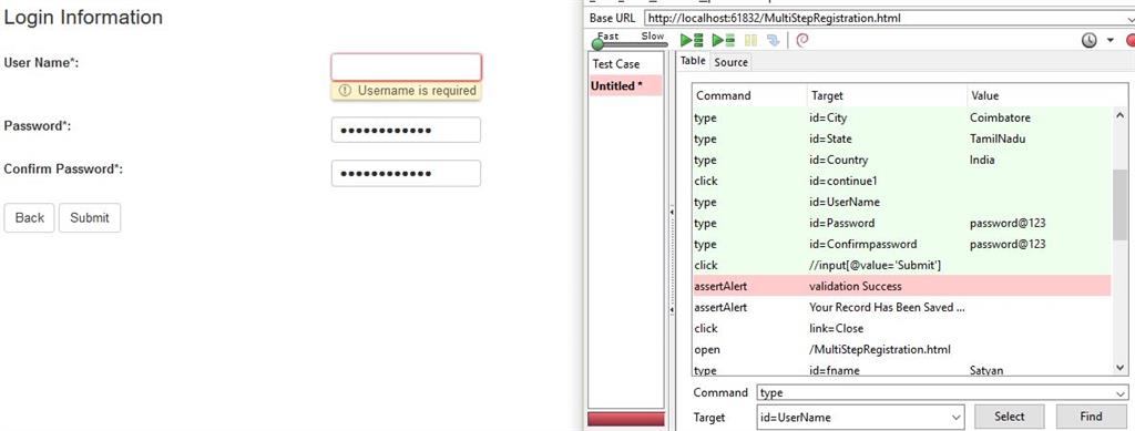 From the preceding figure we can observe that when the validation is not successful the Selenium IDE will hang and indicate where the validation is failed.