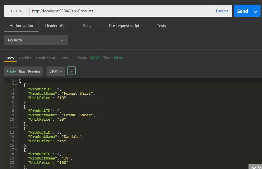 The api/products service response in POSTMAN as in the following figure.