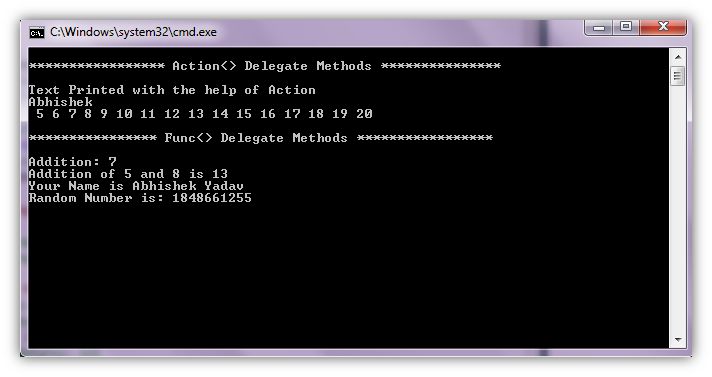 - Func<int> random = new Func<int>(MethodCollections.ShowNumber);