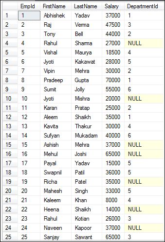 Now both tables are ready with their data. In tblEmployee, some DepartmentIds are not assigned to any employee, hence their DepartmentId is showing as NULL.