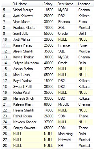 As you can see in the preceding output, non-matching rows are represented as NULL in both the columns.