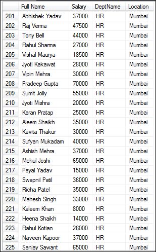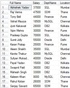 - SELECT e.FirstName+' '+ e.LastName as [Full Name], e.Salary, d.DeptName, d.Location FROM tblEmployee e