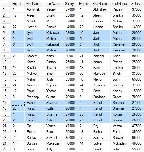 Some of the names like Jyoti, Rahul and so on are repeated 4 times, because there're 2 people with the same FirstName and if we self-join the FirstName of one table with the same FirstName of another table then it'll produce 4 output as represented below.