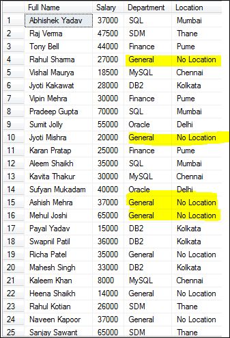 Now as you can see, this data is looking much better than the previous one. Instead of NULL, it says that these many employees belong to “GENERAL Department” and their “Location is not yet specified”.