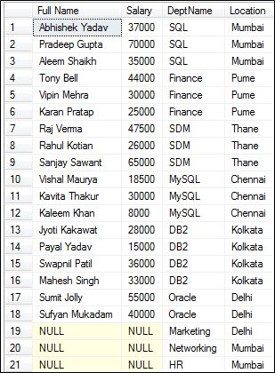 - SELECT e.FirstName+' '+ e.LastName as [Full Name], e.Salary, ISNULL(d.DeptName,'General') as Department, ISNULL(d.Location,'No Location') as Location FROM tblEmployee e