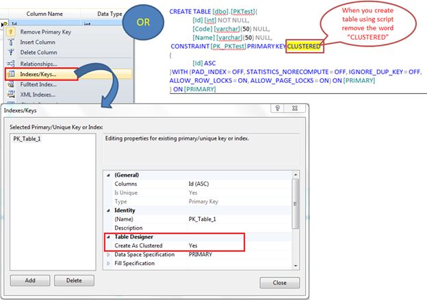 When we create a table using a GUI (SQL Server Management Studio) and defining a primary key, SQL Server automatically creates the clustered index on this column. But we can change it using the "Indexes/Keys" property of that column. When you create a table using a SQL script, write the create table script without the word "CLUSTERED". Now SQL Server will create a Non-Clustered Index on the primary key.