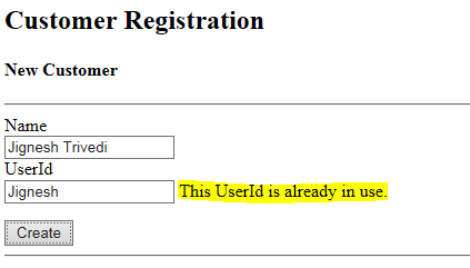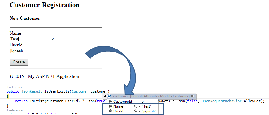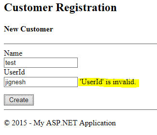 For example, I want to create a customer registration form and it has a user id that must be unique within the database. I want to validate this user id using a remote attribute. The Following is the procedure to use a remote attribute in this case.