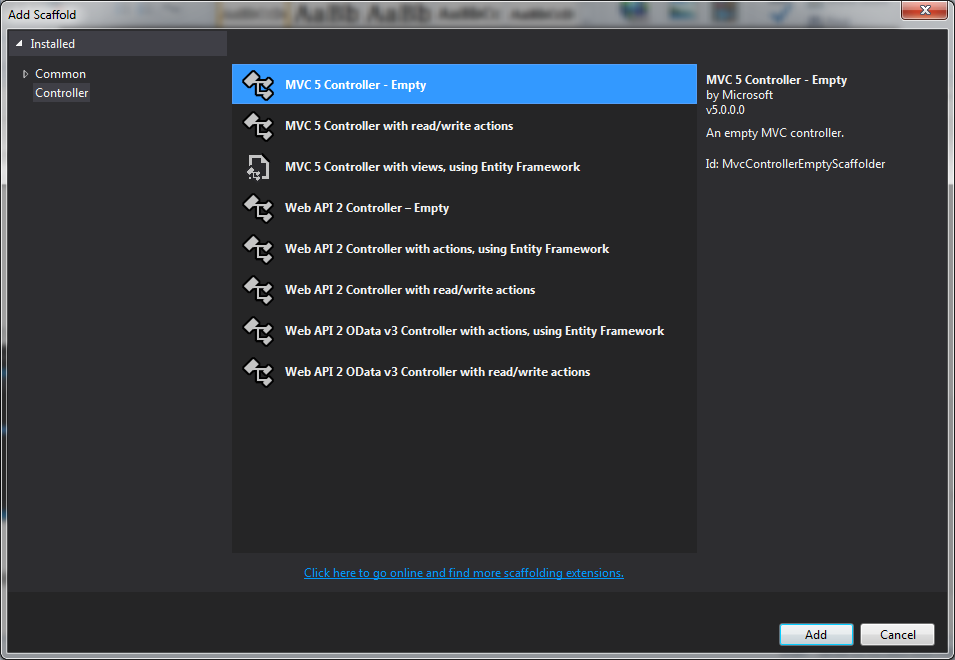 Add an “Empty” Controller by right clicking on the “Controller” folder. Select “Add” then select “Controller..”. In the popup select “MVC 5 Controller”, then click “Add”. In the next popup you should give the name “CRUDController”.