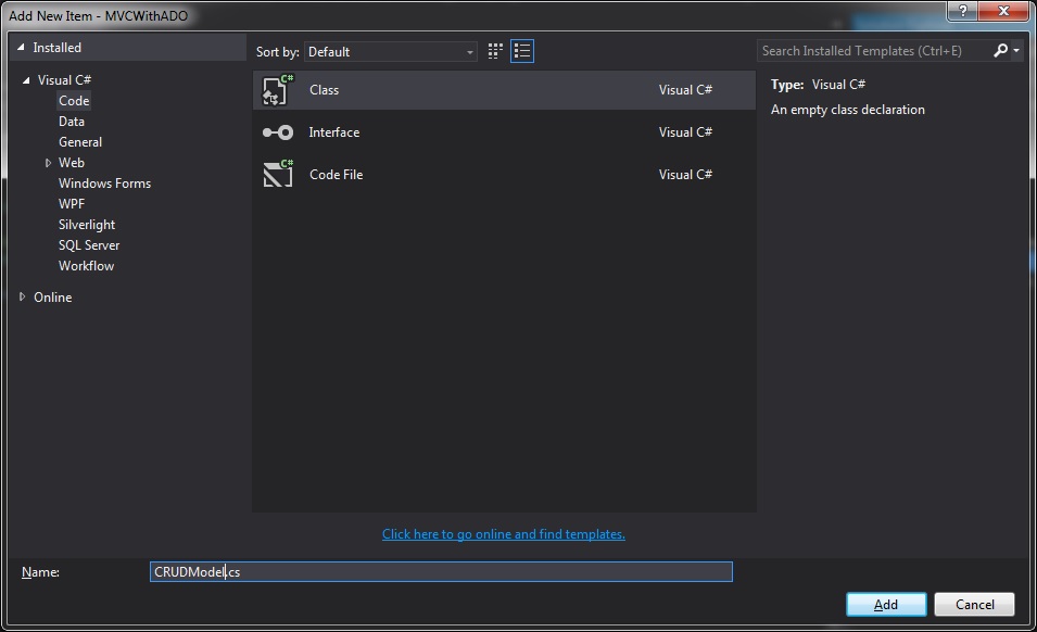 - In the popup, select “Code” then choose “Class” and name the class file as “CRUDModel” then click “Add”. That’s all!