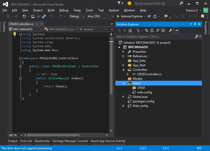 After adding the controller, you may notice as per the “convention” in ASP.NET MVC under the “Views” folder, a new folder named “CRUD” also created.