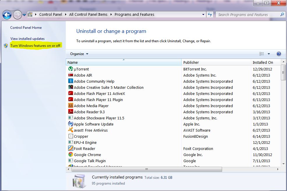 Step 2: In the left hand side, click on the link “Turn Windows features on or off”.