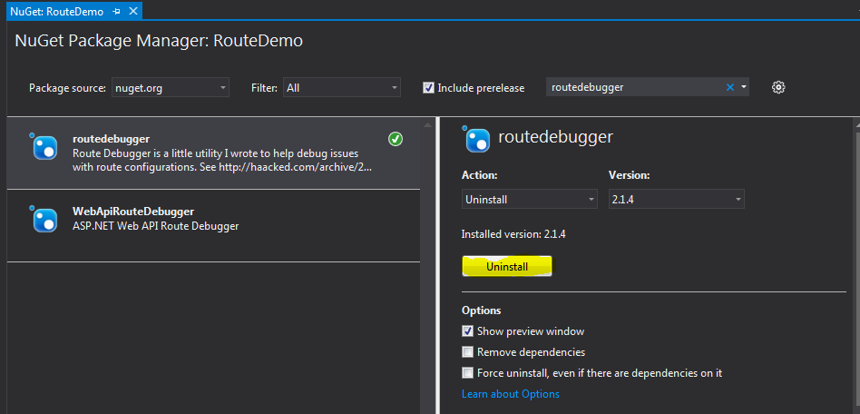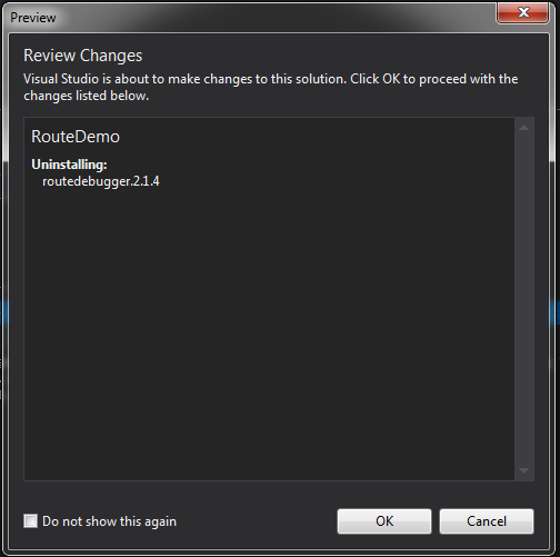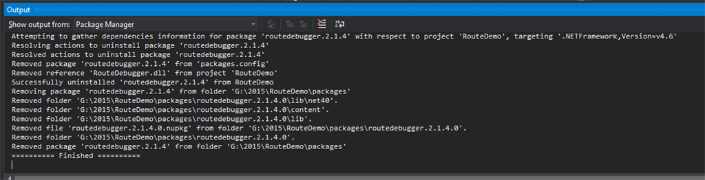 Step 1: In order to uninstall, just type the following command in the “Package Manager Console” and hit enter, it will uninstall the package: Uninstall-Package routedebugger.