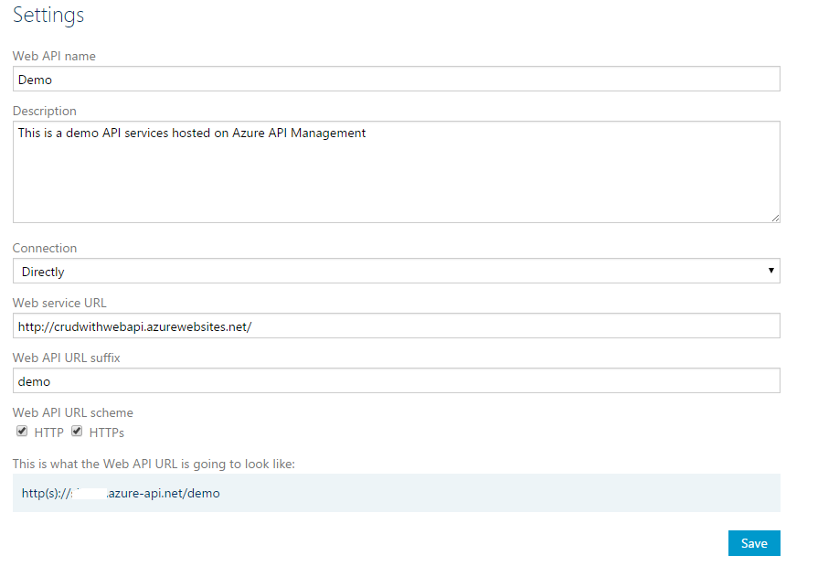 - We provide an actual address where our WEB API is hosted, please refer to the preceding section, where we discussed the deployment of our WEB API to Azure. http://crudwithwebapi.azurewebsites.net/ into the Web service URL. Web service URL references the HTTP service implementing the API. The API management forwards requests to this address.