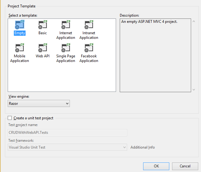- Select Empty Web API using Razor View Engine.