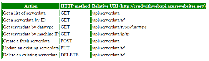 http://crudwithwebapi.azurewebsites.net/ We will try to discuss very simple resources in this article. The following are the resources of our Web API: