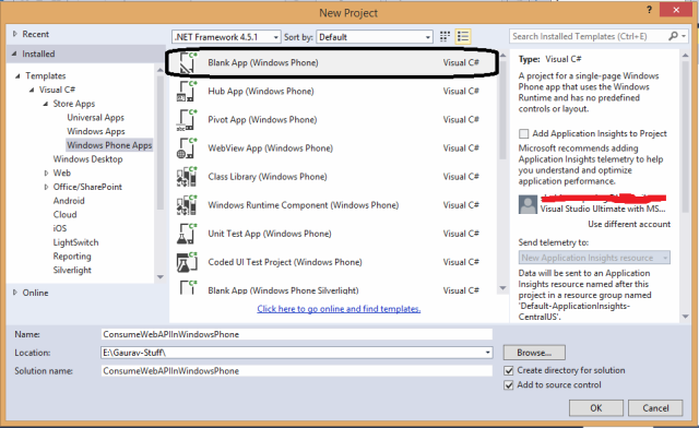 - Provide a name to your new project, I called it ConsumeWebAPIInWindowsPhone to make it a self-explanatory name