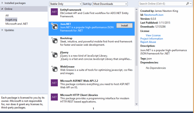 We will consume ASP.NET Web APIs with a JSON response, so, we need both a HTTP client and JSON.NET (to serialize/deserialize our JSON data).