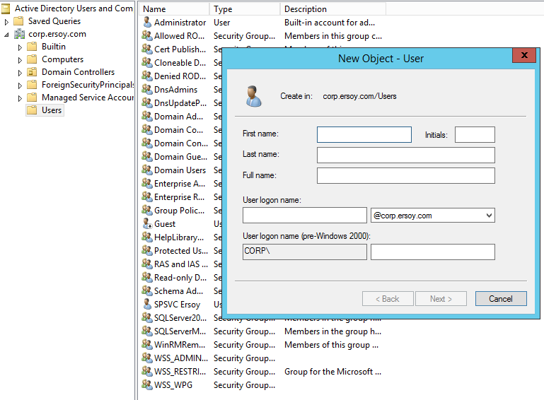 Below the forest name (for me it is corp.ersoy.com), right click on Users and Select New, then User.