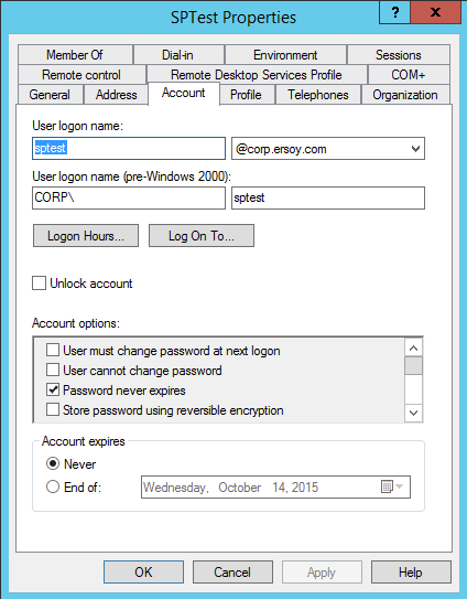 Feel free to fill the information as you like, but in our sample I've created a test account named "sptest".