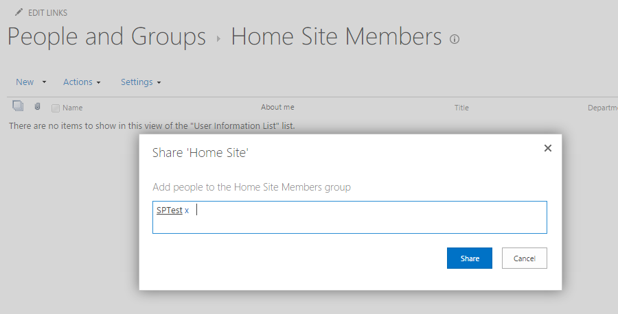 I wanted "sptest" user to be in Site Members permission group so I added my new user there: