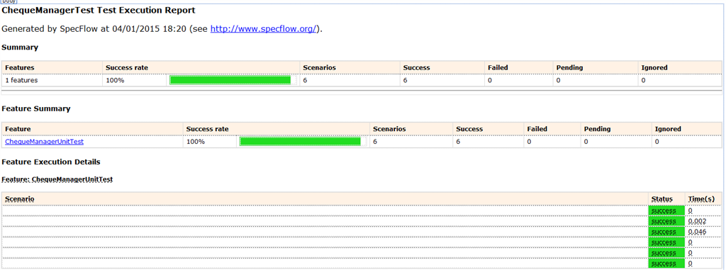 The sample added Specflow test feature file is as given below (ChequeManagerAcceptanceTest.feature). Testers can add multiple test cases in the similar format in the feature file. Finally the Specflow tool generated unit test project is based on the test scenarios and handover to the development team. Observe the code file attachment to get more details.