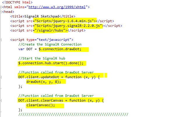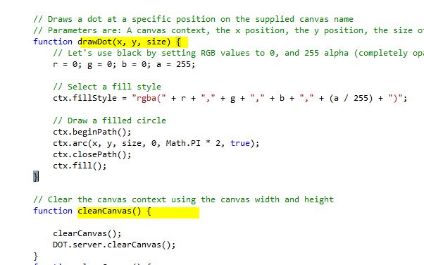 - The UpdateDot function is called from the server to update the drawing on the canvas (NOTE: In the server code, the updateDot is in camelCase like UpdateDot).