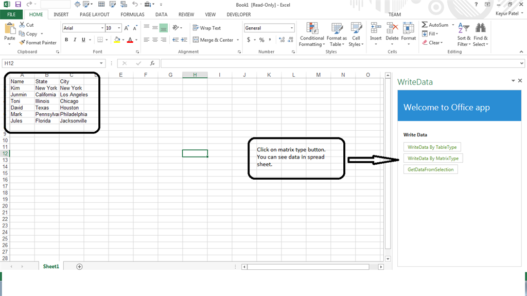 Build your project and run it. Click on the WriteData By MatrixType button in the task pane. You can see the data render in the "
