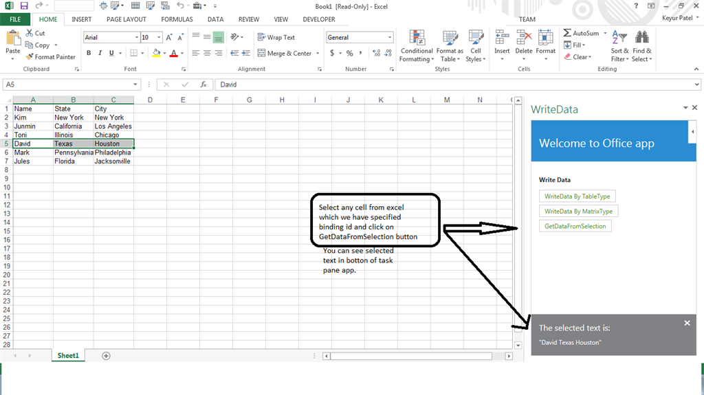 F5. Select cells from the Excel sheet. Ensure you select the cell that has a binding type assigned otherwise it cannot read the selected data. Click on the last button (GetDataFromSelection) in the task pane. You can see the current selected data as a notification in the task pane app.