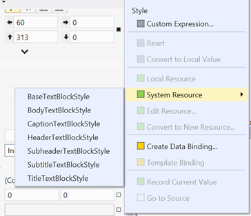 Click the property marker (little rectangle) next to the Style property to open the menu. You will see System Resources and when you select that, you will see a list of System Resources that can be used to style a TextBlock.