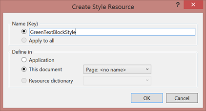 In this dialog, you provide the style resource name and if you want to define it as the application level or the document level. The application-level resources are defined in the App.xaml and the document level resources are defined in the page XAML.