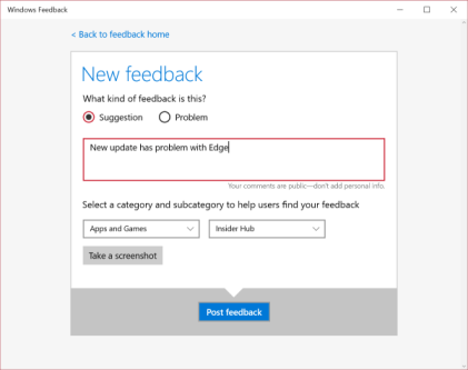 Microsoft has made really easy for Windows 10 users to point out problems and give suggestions to the Microsoft team working on Windows 10 via the Insider Hub app. You must signup for Microsoft's Insider program to give the feedback.