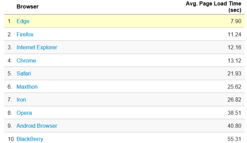 As you can clearly see from the preceding table, Microsoft Edge is much faster than any other browser out there including Chrome, IE, and Safari. Average page load speed in Edge is 7.90 seconds followed by Firefox 11.24 seconds and IE 12.16 seconds.
