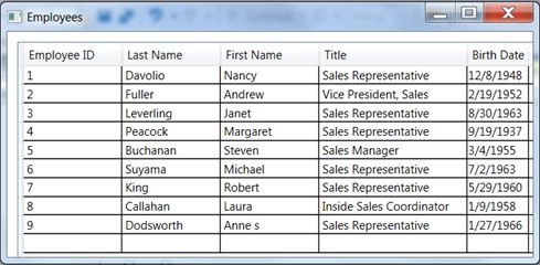 - EmployeeDataGrid.ItemsSource = GetAllEmployees();