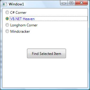 RadioButton represents whether or not a RadioButton is checked. The following code snippet on a button click event handler finds the text of the selected RadioButton in a group.