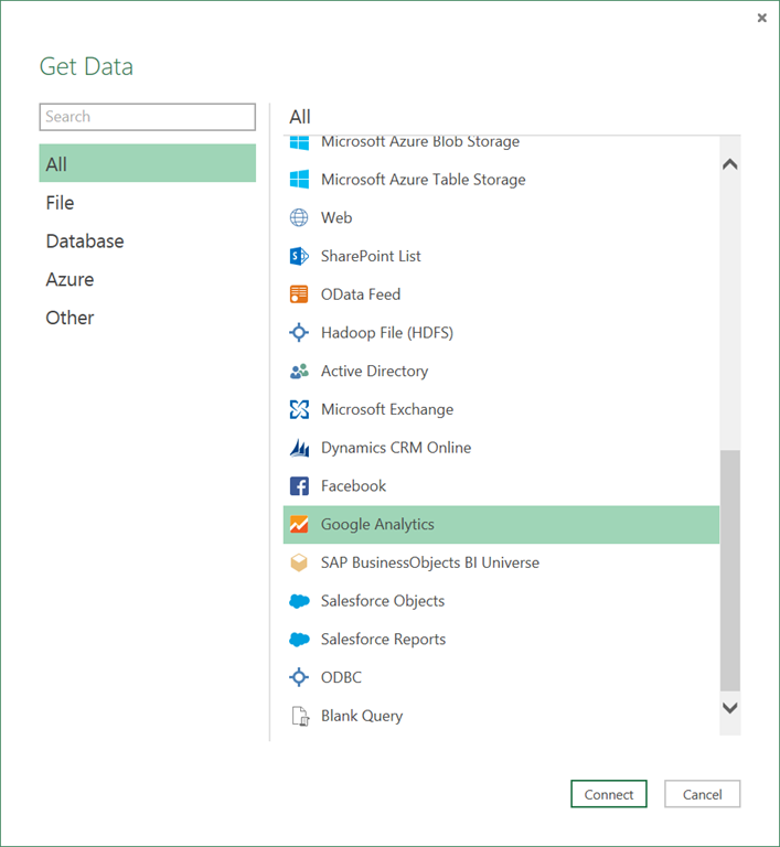 To work with Google Analytics, open the Power BI Designer, select Get Data and select Google Analytics from the list of data sources.