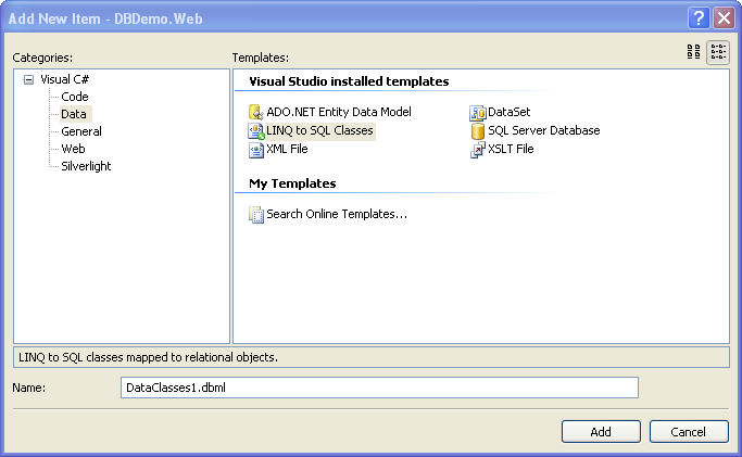 Select the second project in the Solution Explorer which is named DBDemo.Web. Right Click and select Add New Item. Select LinqToSQL Classes as shown in Figure 3.